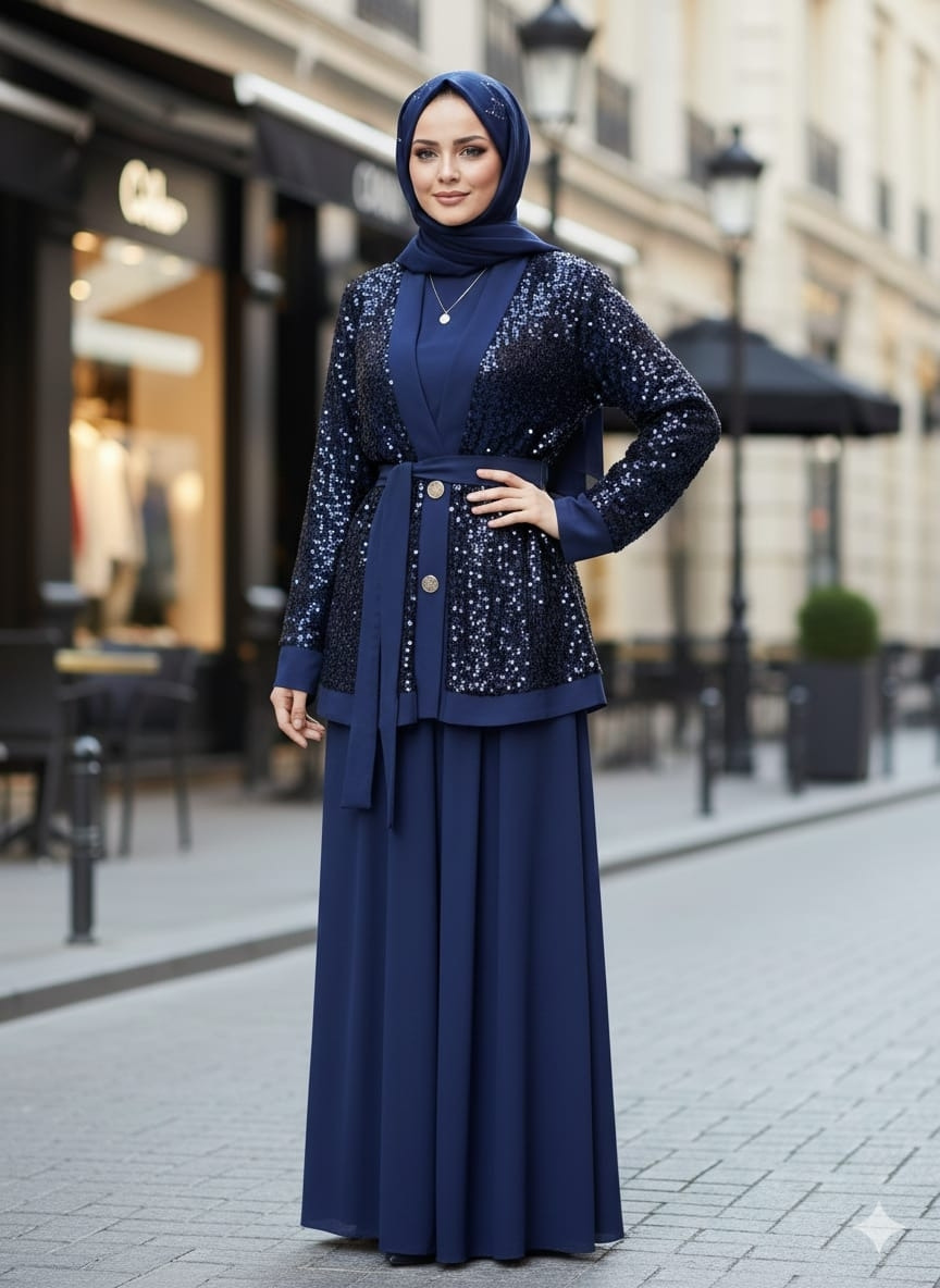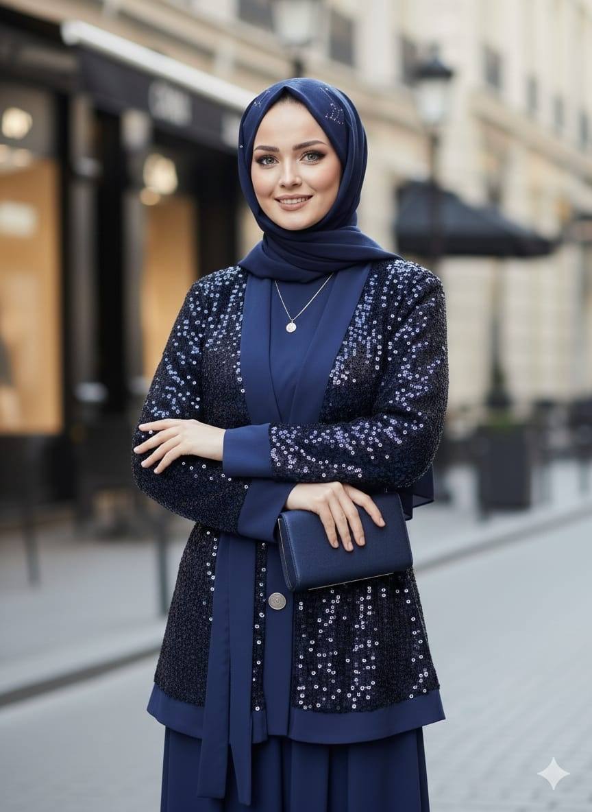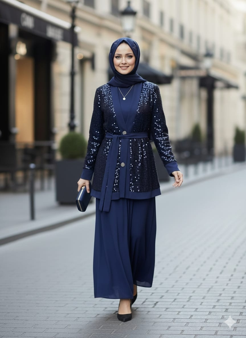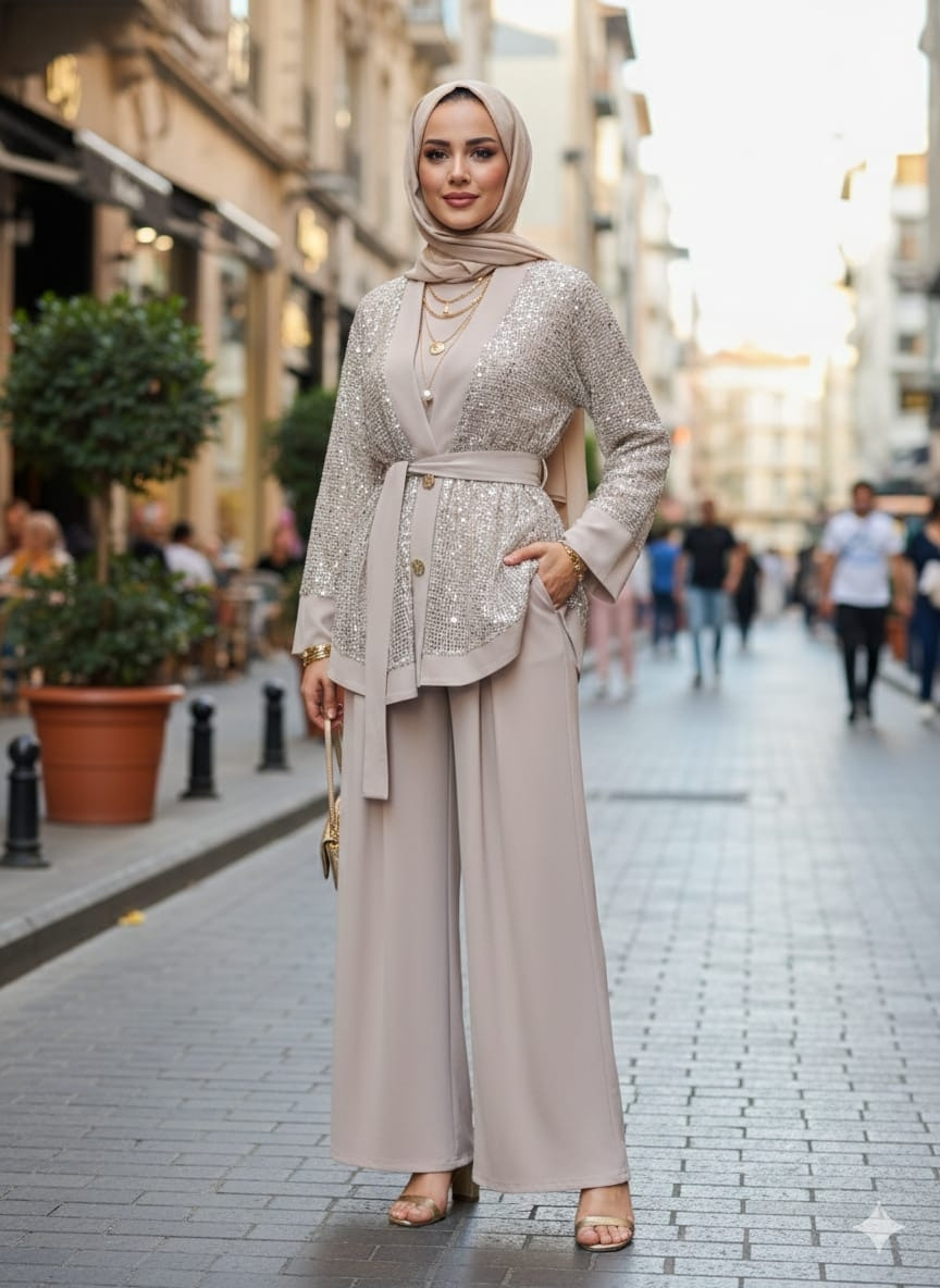 Işıltılı pul payet file hırkası ve konforlu buzzy kumaş iç takımıyla hem şık hem rahat bir kombin sunan 3’lü set. Günlük şıklıktan özel davetlere kadar zahmetsiz elegan görünüm sağlar.